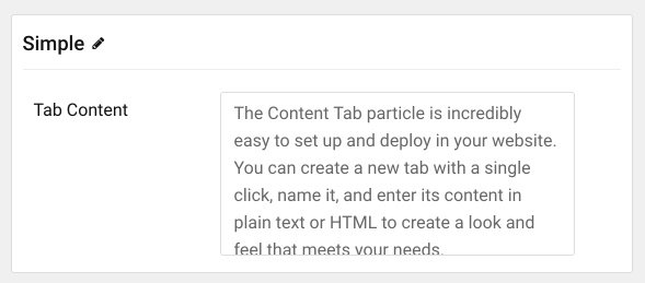 The Content Tab particle is incredibly easy to set up and deploy in your website. You can create a new tab with a single click, name it, and enter its content in plain text or HTML to create a look and feel that meets your needs.